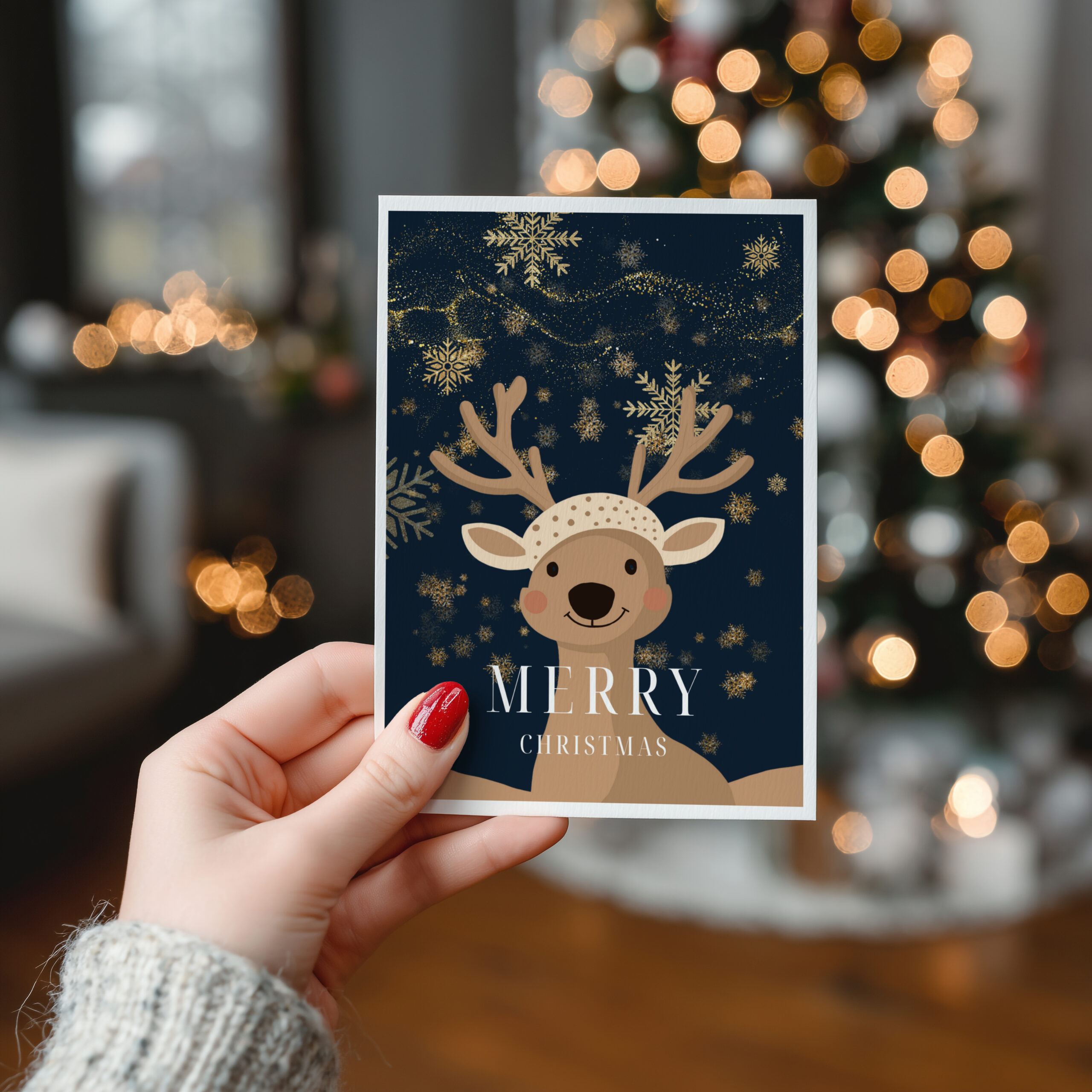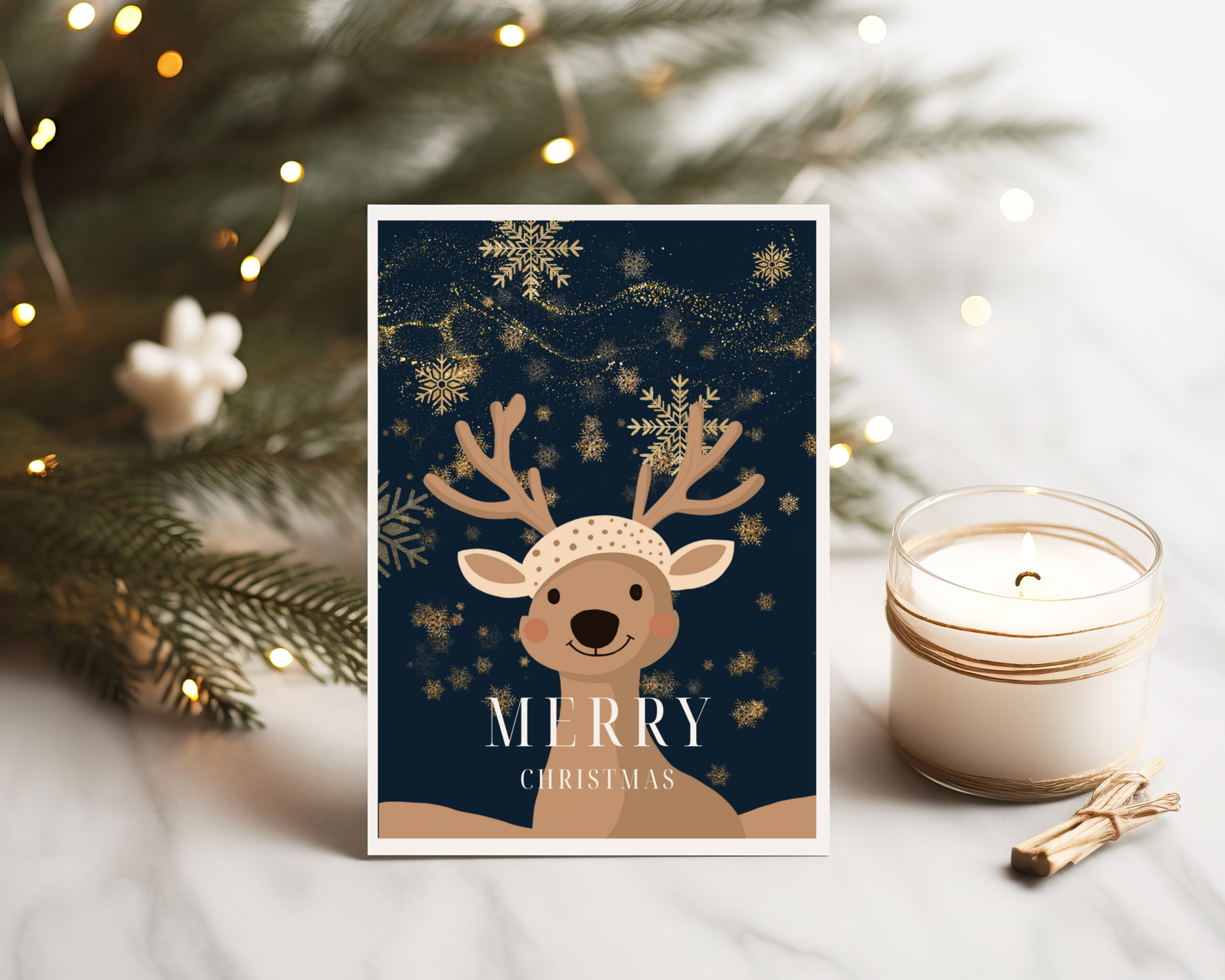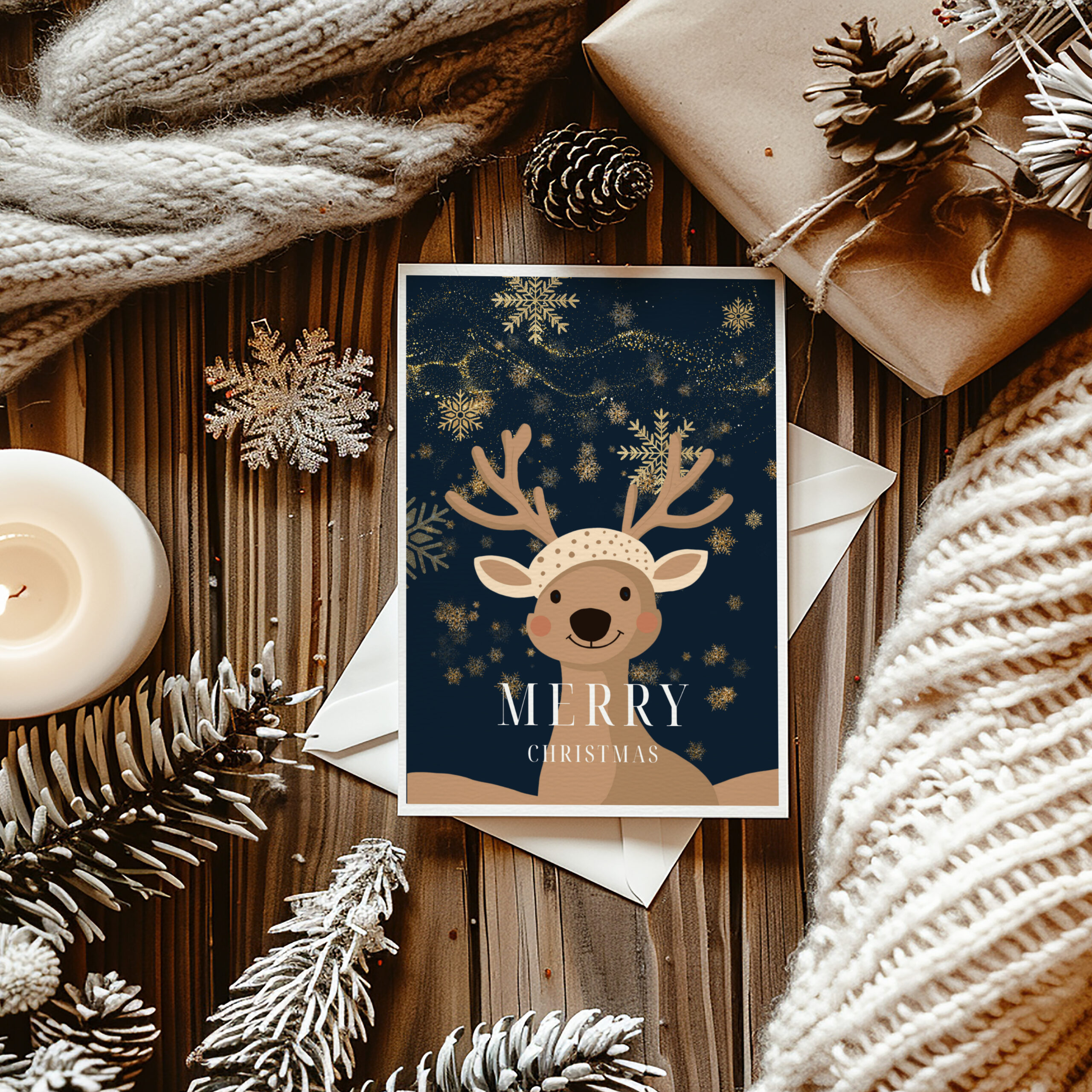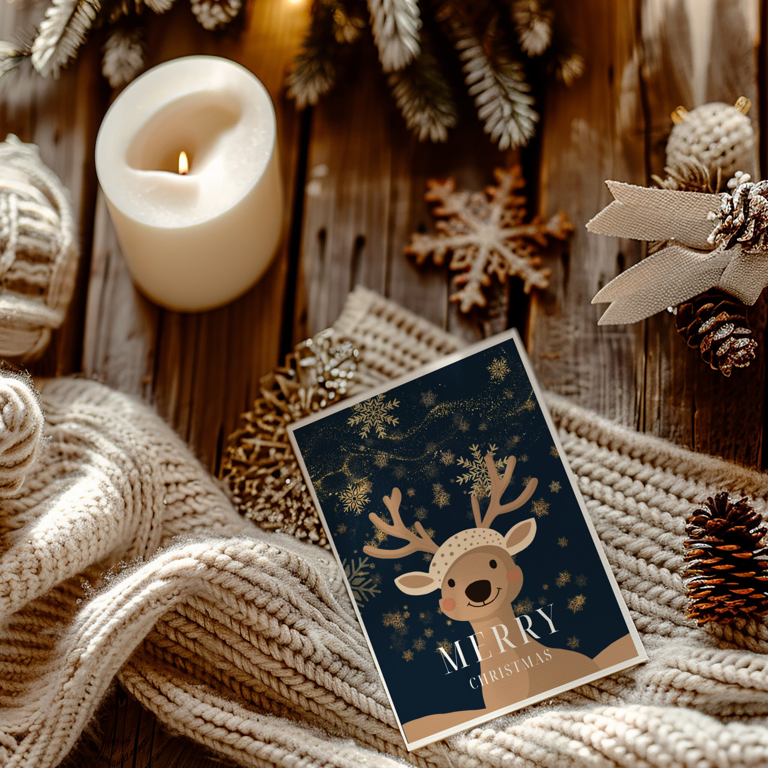 Le renne, symbole d’enfance et de magie, évoque la saison des rêves et du réconfort. Ainsi, la carte devient un petit cadeau en soi. Elle inspire, apaise et fait sourire.